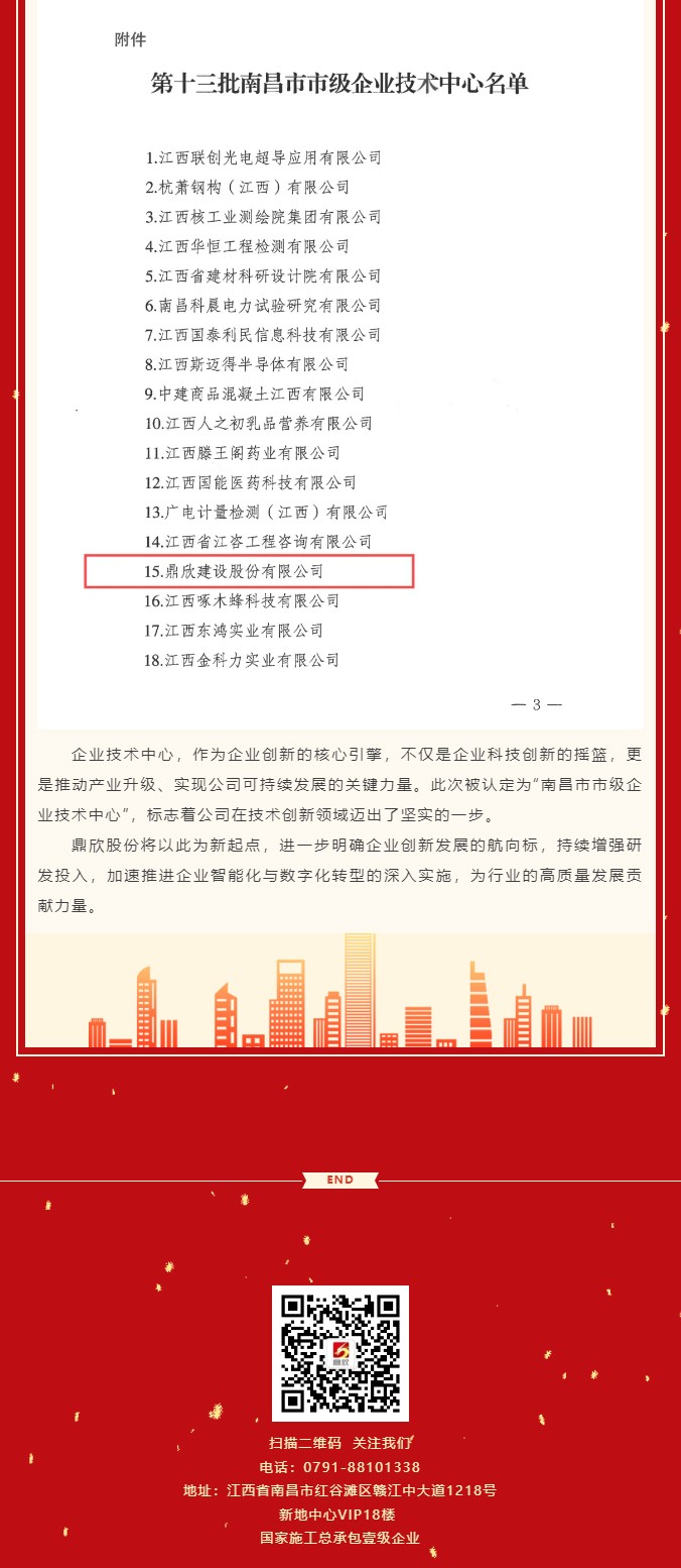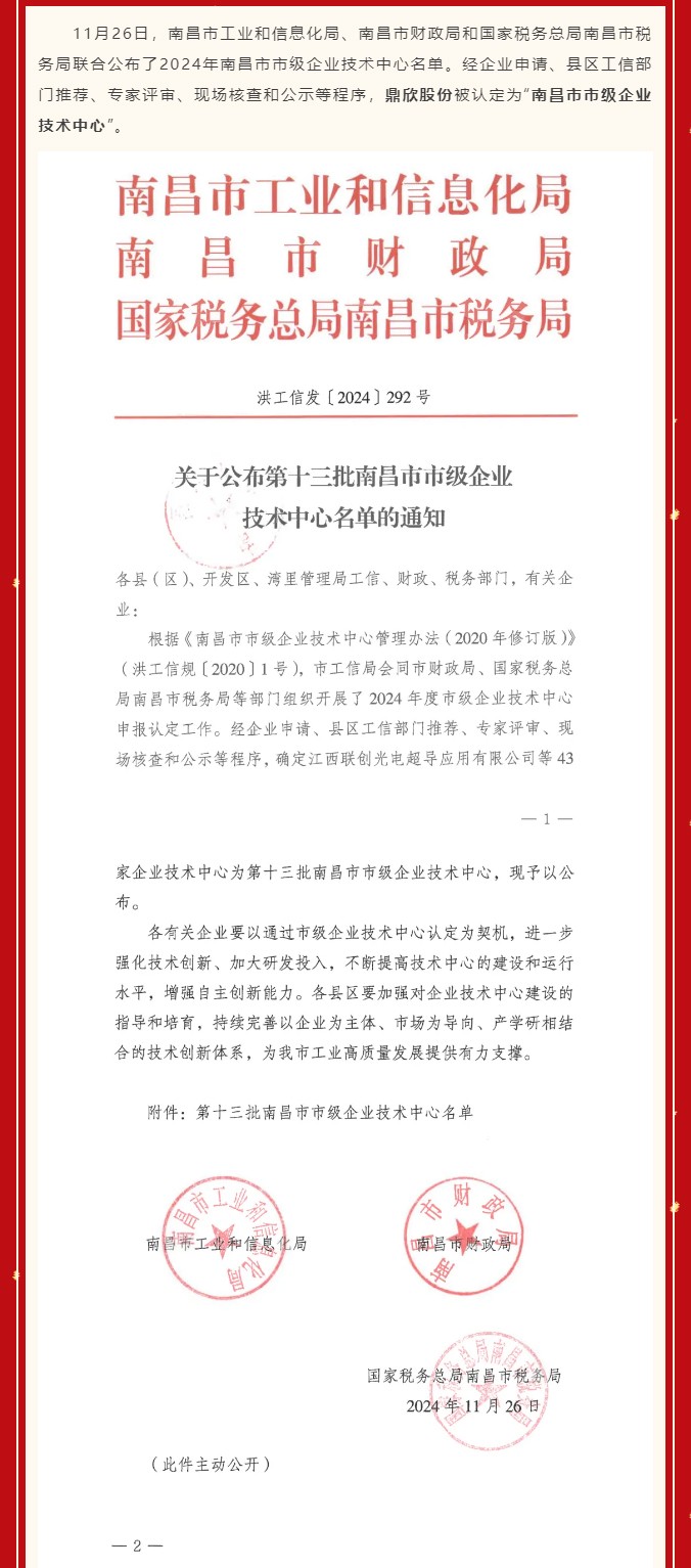 荣誉 | 鼎欣股份荣获南昌市市级企业技术中心认证